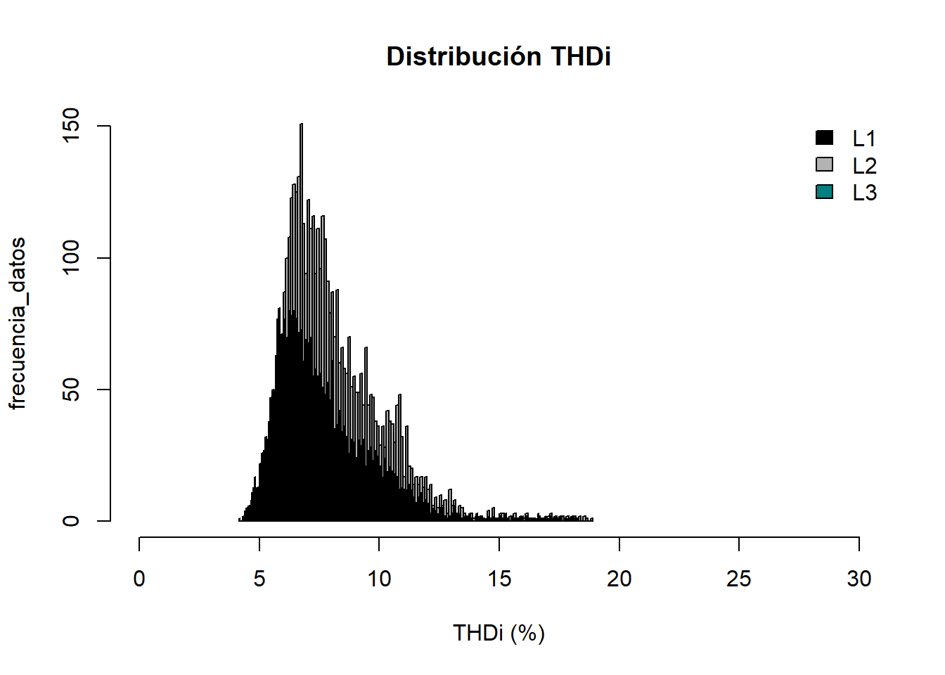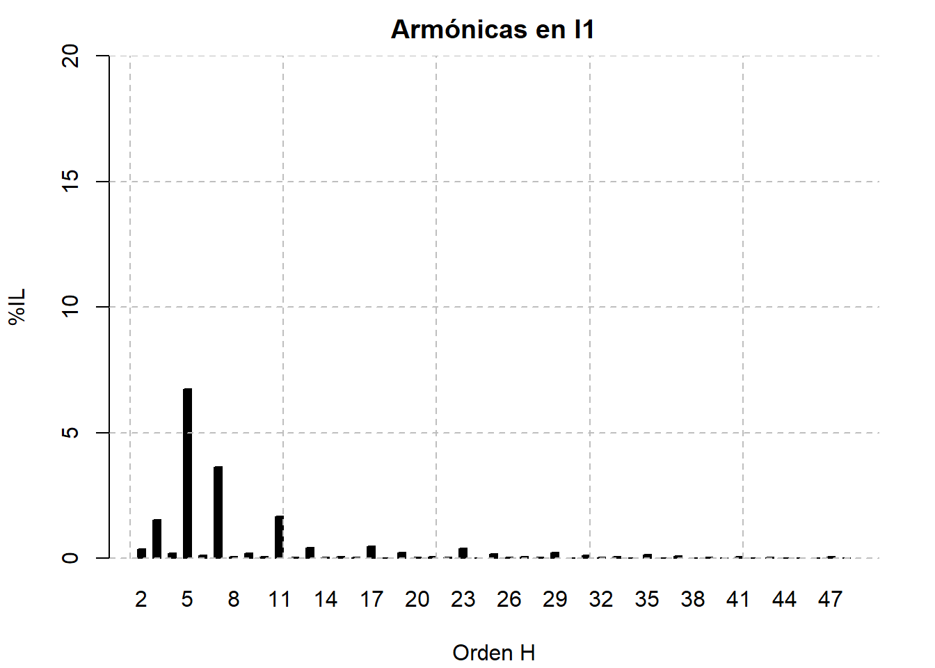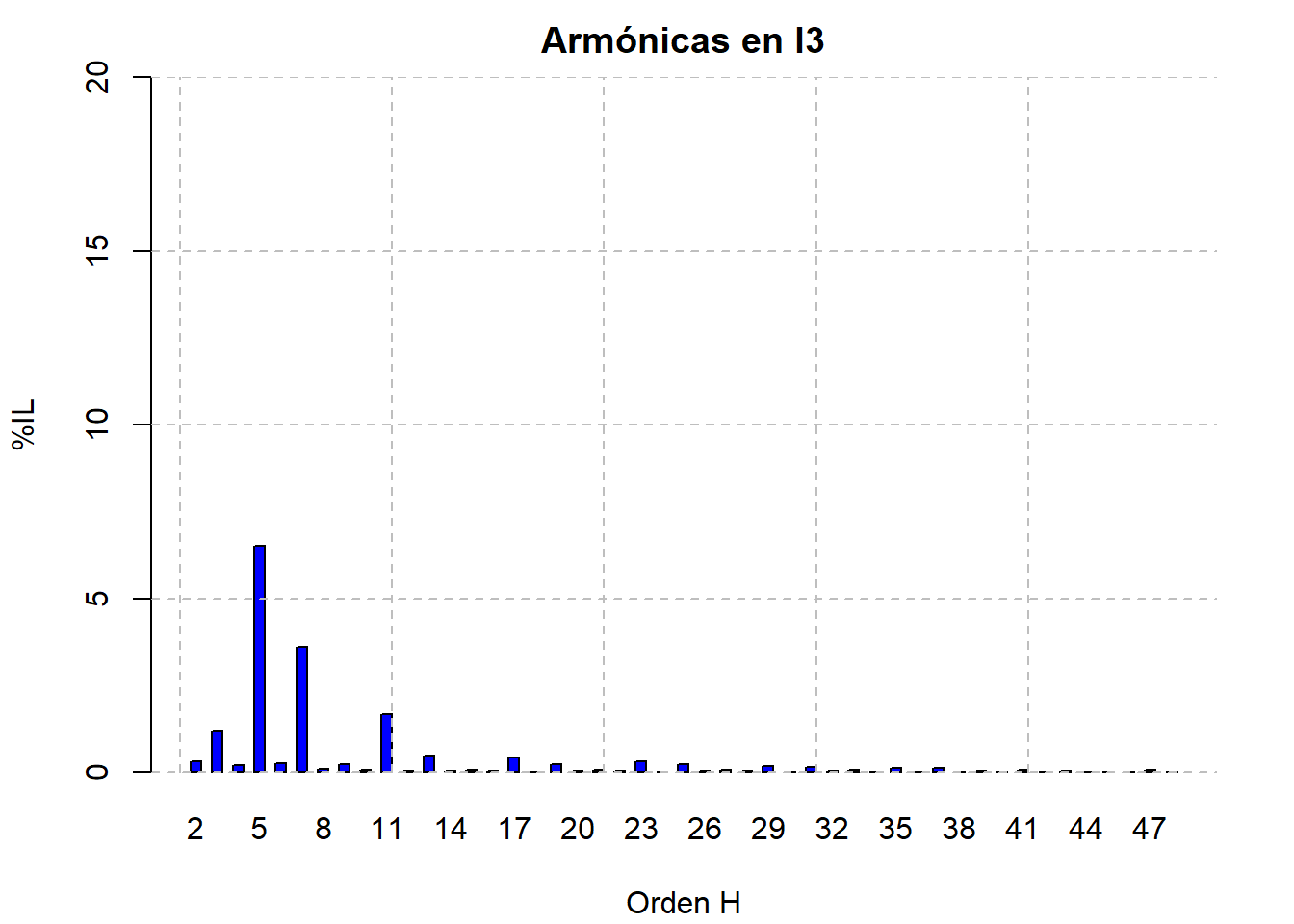 El comportamiento de las armónicas de la corriente sigue un comportamiento normal, donde las magnitudes de las armónicas siguen el orden de 5ª, 7ª, 11ª donde la armónica 5ª es la de mayor magnitud, seguida de la 7ª y 11ª, 3ª, 13ª, 17ª, etc., y un promedio de THD del 7.5%.